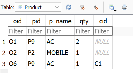 WHERE cid = 'C5';AFTER DELETING CID='C5', CUST TABLE'S C5 ROW WILL BE DELETED COMPLETELY BUT ONLY CHILD TABLE I.E PRODUCT TABLE'S CID COLUMN'S PARTICULAR DATA(I.E. C5) WILL REPLACE BY NULL.